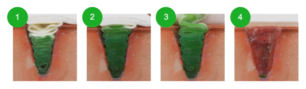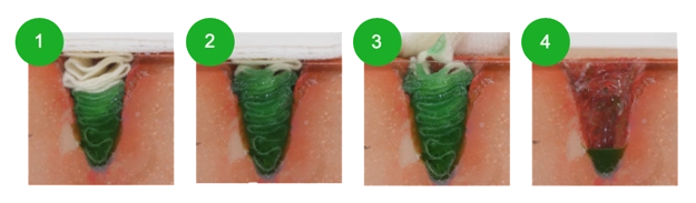 Os curativos Exufiber® transferem eficientemente o exsudato do leito da ferida para o curativo secundário assim que estão saturados, prevenindo o represamento e evitando a maceração das bordas.